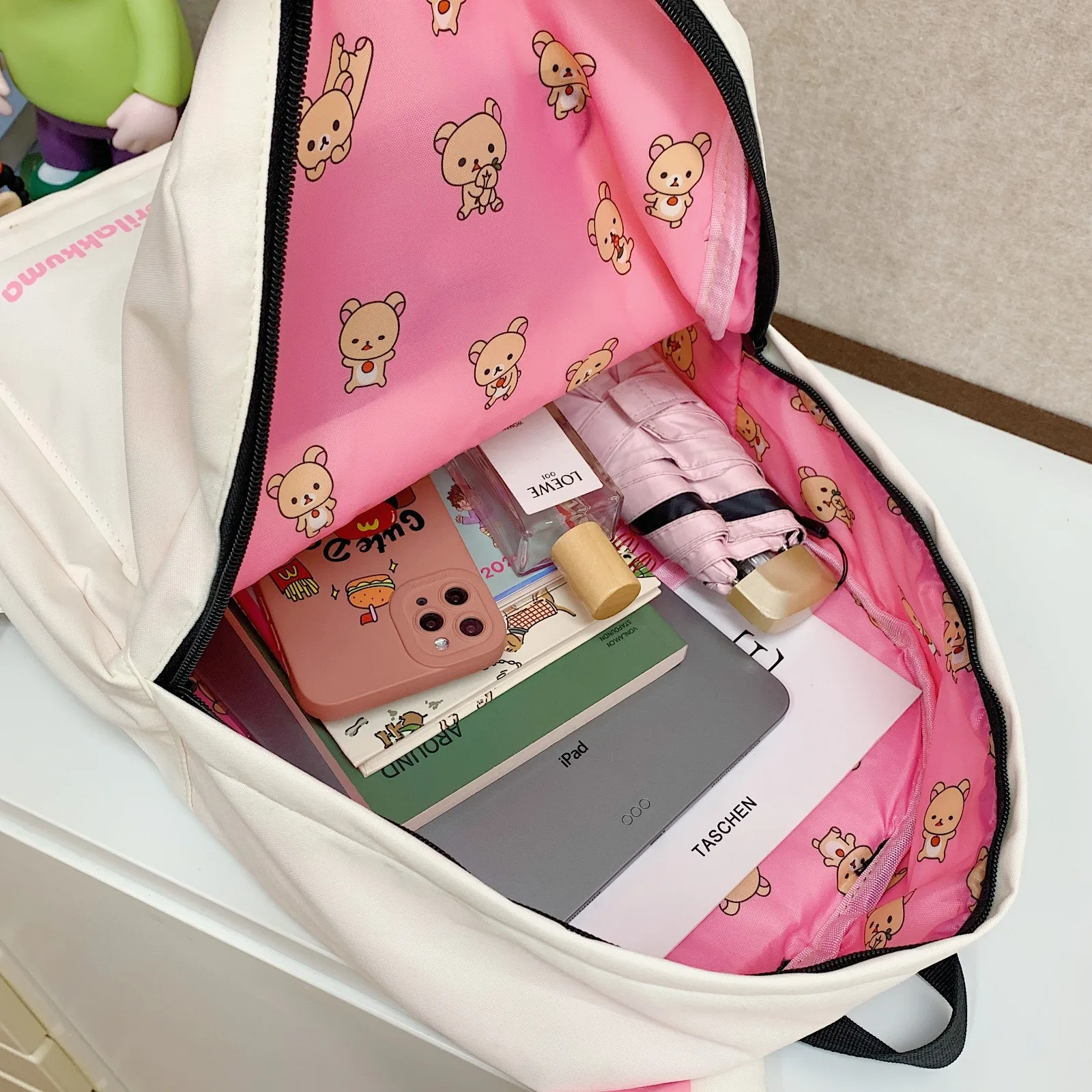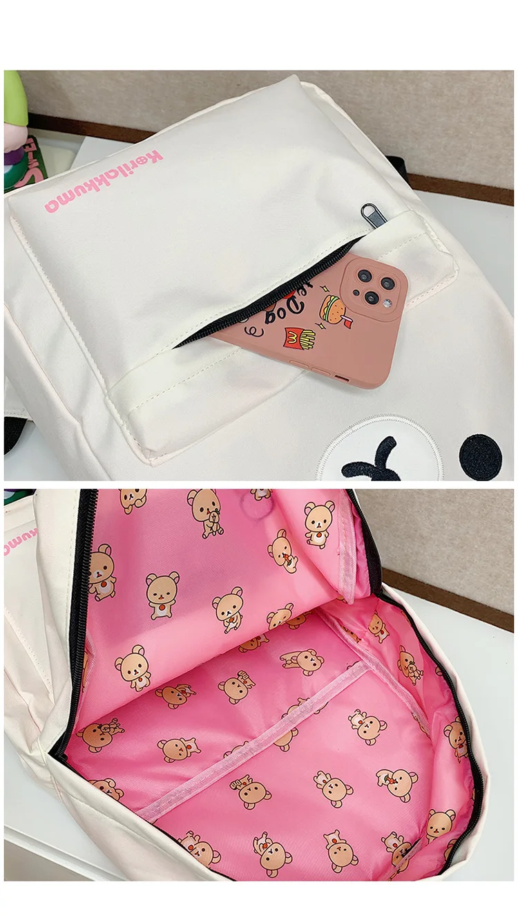 Essa mochila estilo kawaii com tema de ursinho é ideal para quem gosta de um visual divertido sem abrir mão de praticidade. Com grande capacidade interna, ela comporta livros, cadernos, estojos e outros itens essenciais para a rotina escolar.